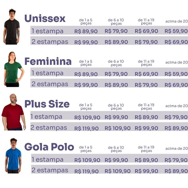 Abaixo, segue tabela de preço (considerando que você já tenha as artes prontas e em formato vetorizado.)